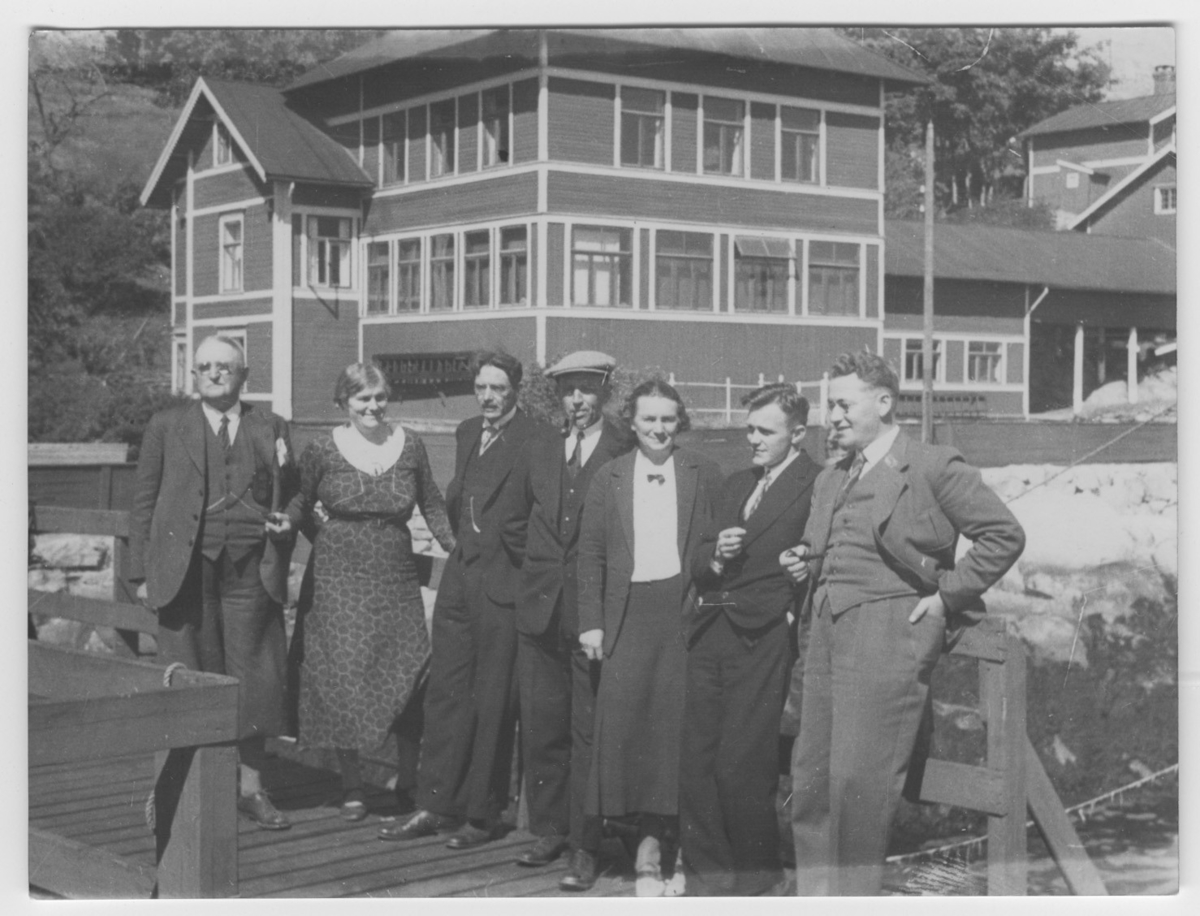 'Gruppbild, 7 personer varav 2 kvinnor och 5 män stående på brygga nedanför Biologiska Stationen i Trondheim. :: Från vänster: Leonard Axel Jägerskiöld, fru Hanson, Dr Nils Odhner, Kapten Bewh. Hanson, fröken Fröseth?, fru Hansons nevö och längst t.v. Sune Swärd. :: :: Även fotonr 3692 :: :: Ingår i serie med fotonr. 3694-3719 se även fotonr. 3679-3693.'