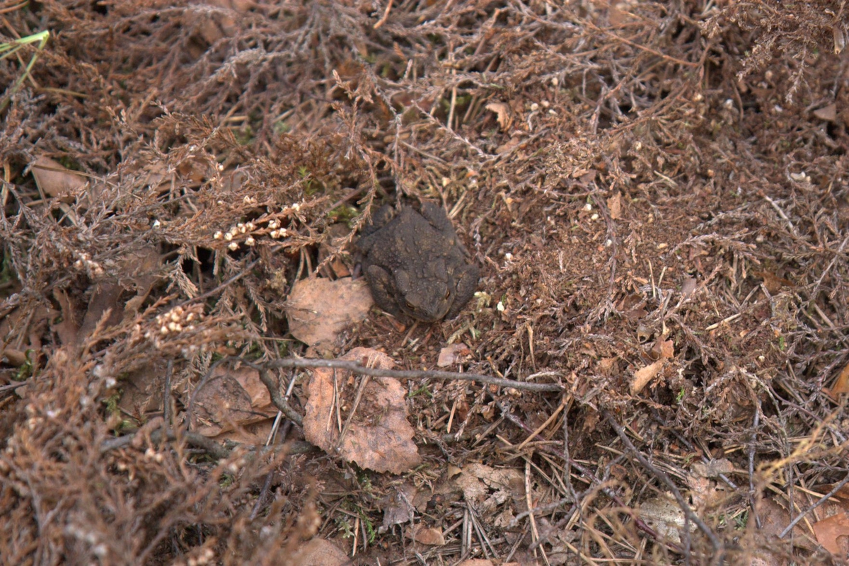 'Bilder från Rambomosse, tagna under arbete med inventering av hasselsnok vid Rambomosse och Hålsjöområdet: :: :: Vanllig padda i ljungvegetation. :: :: Ingår i serie med fotonr. 7075:1-42. Bilderna tagna i samband med arbetet att skriva en rapport om ''Hasselsnoken vid Rambo mosse''. Rapportens författare, Leif Lithander, Anders Nilsson och Göran Nilson, Göteborgs Naturhistoriska Museum 2007-11-27.'