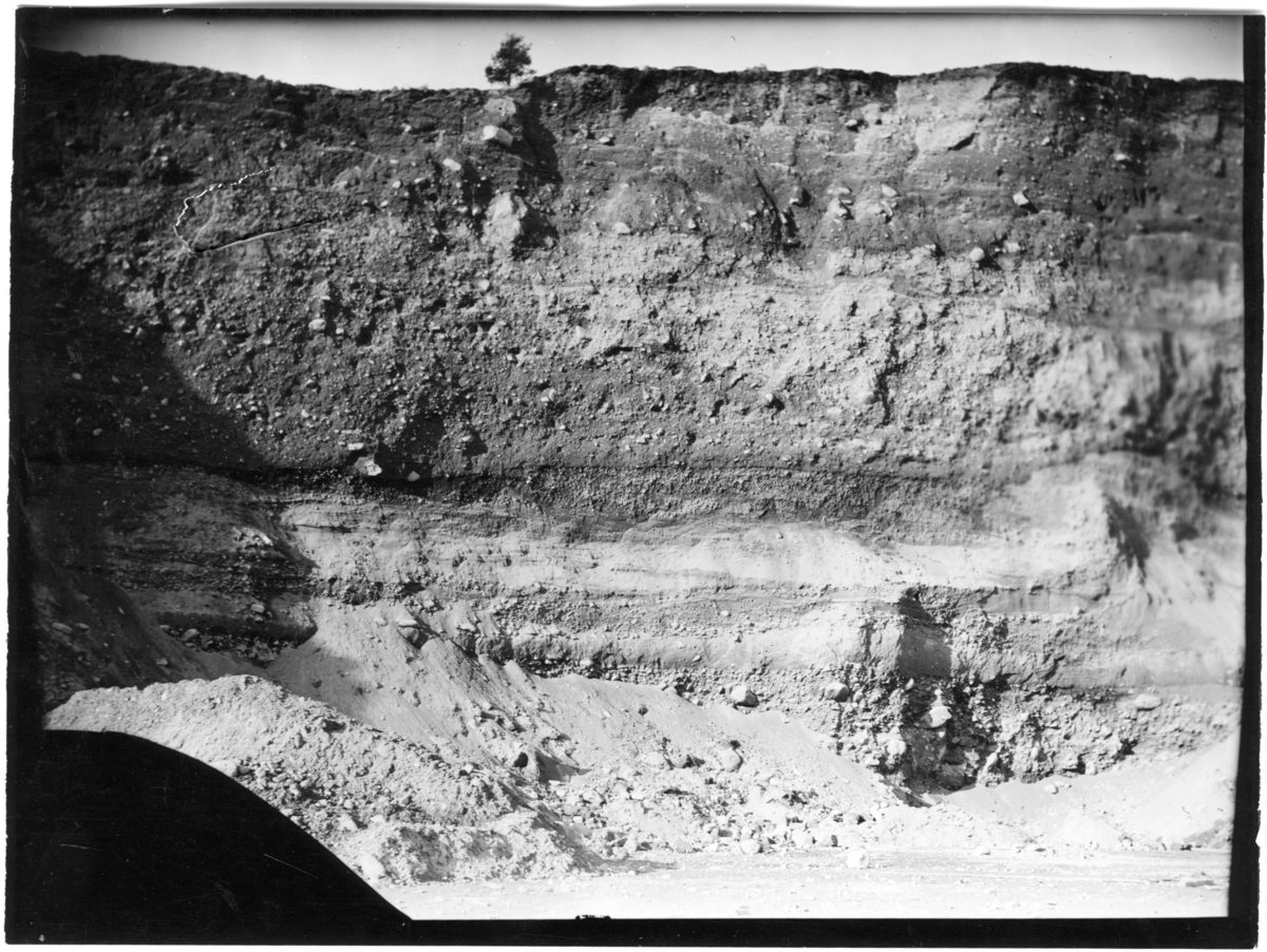 'Översiktsbild över vägg i grustaget. Bildtext: ''Dösebacka, södra delen av väggen i södra grustaget där mammutbeten hittades 1931. Fig. 1. Söder till vänster i bilden och norr till höger i bilden.'' :: :: Ingår i serie med fotonr. 7058:1-32.'