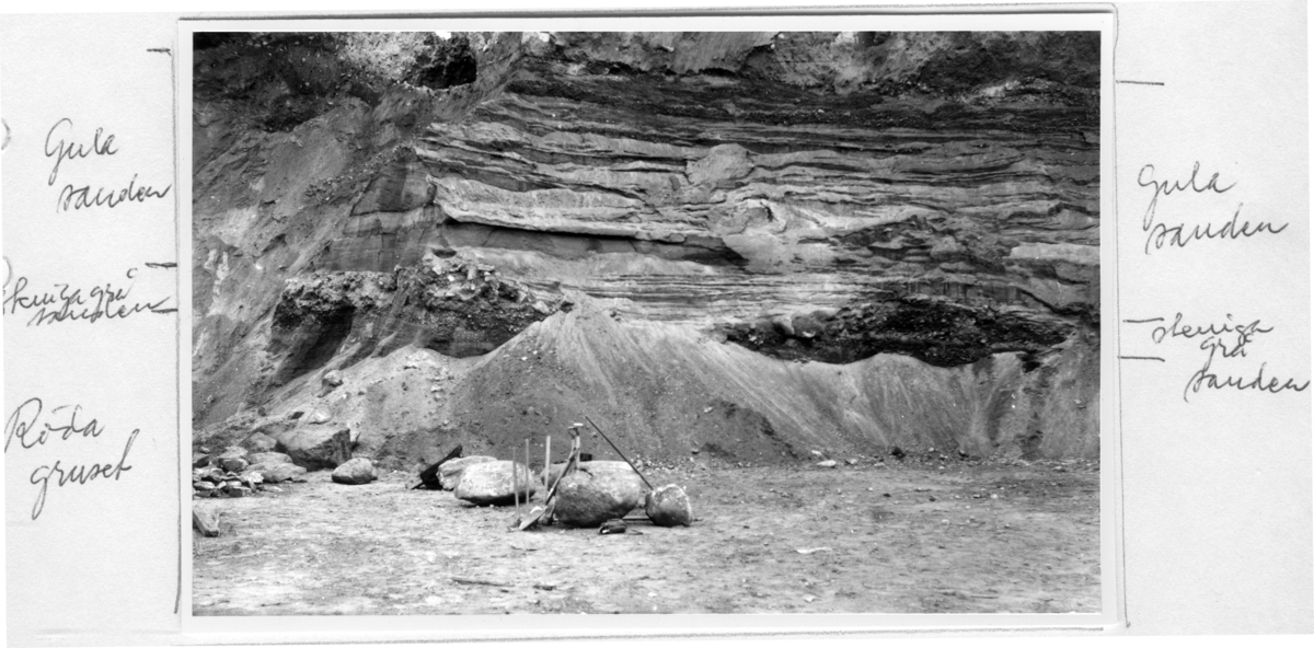 'Lagerföljden hos grusavlagringens, i förgrunden stenblock med redskap lutade mot dem. Detaljbild från Fotonr. 7058:5. Moränens lagerföljd enligt anteckning till bilden: Gula sanden, steniga grå sanden och röda gruset längst ner till vänster i bilden. Gula sanden och steniga sanden längst ner till höger i bilden. :: :: Ingår i serie med fotonr. 7058:1-32.'