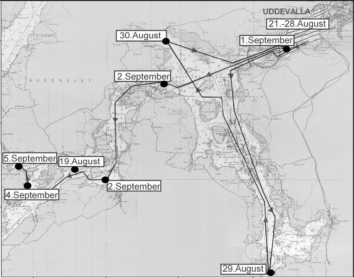 'Karta visande var näbbvalen ''Valder'' iakttogs innan han dog. :: :: Skelettet till näbbvalen är monterat och hänger i valsalen på Göteborgs Naturhistoriska Museum. Då näbbvalen sågs utmed kusten kom den att kallas Valder i media. :: :: Ingår i serie med fotonr. 7106 med bilder på näbbvalen som levande och under arbetet med att montera skelettet.'