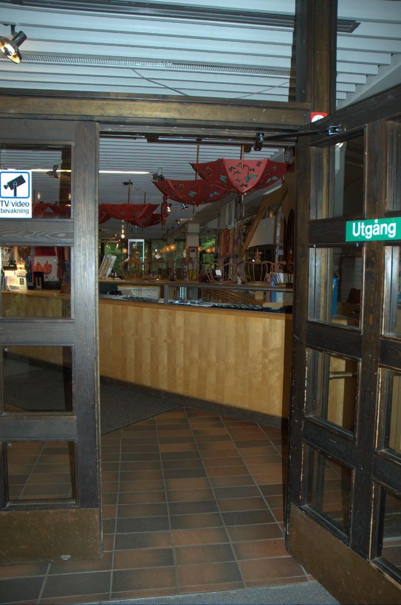 'Entrédisken sedd genom ytterdörren vid entrén. :: :: Fotonr. 7095 består av en bildserie som dokumenterar diverse utrymmen i byggnaden så som kontor, arbetsplatser, arbetsrum, magasin m.m. Bilder tagna före och efter olika ombyggnationer bl.a.'