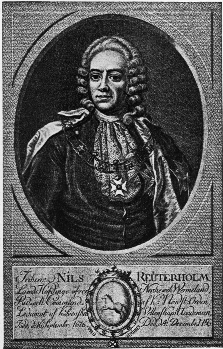 'Nils Reuterholm. Efter ett samtida kopparstick. :: :: Ingår i fotonr. 5305:1-50 med Leonard Axel Jägerskiölds föredragsbilder om ''Linnés resor och berömda män'' (Arkivnr.1).'