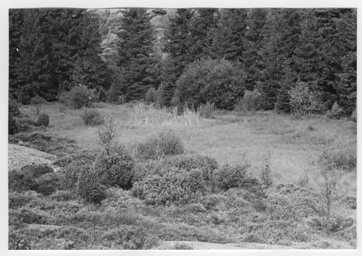 'Bildtext: ''Kärr i bergskreva. Riktning 344.'' :: Vy över kärr med omgivande trädvegetation av gran och lite lövträd. Enbuskar på berghäll i förgrunden. :: :: Ingår i serie med fotonr. 6970:1-1125, dokumentation av Hisingens naturgeografi, visande landskapsformerna i stora drag och gjord inför exploateringen av området. Platserna för fotograferingen finns utsatta på karta i skala 1:4000 som finns på Göteborgs Naturhistoriska musem. Fotoriktningen mättes med kompass i gammalgrader.'