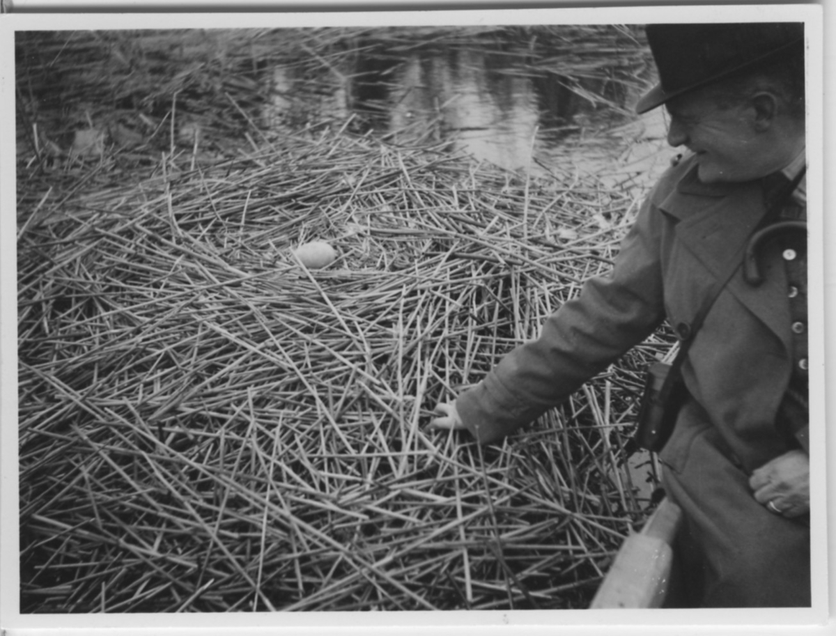 'Biologiska föreningens utfärd till Tåkern, Vadstena m.fl. platser: :: :: Svanbo med 1 ägg liggande i vattnet i sjön. 1 man sitter i en eka intill boet. :: :: Se fotonr. 3588-3634 samt 3661-3677.'