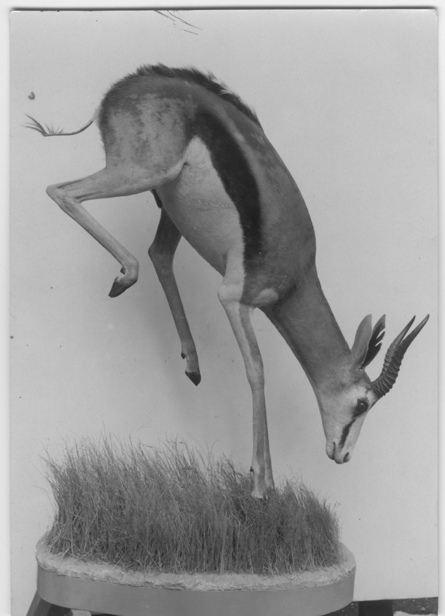 'Springbock, hane adult, sedd från sidan. Monterad ''ståendes på huvud''. Fynddatum: 1912-10-15. Monterad av Hilmer Skoog. :: :: Montaget finns utställt på Göteborgs Naturhistoriska Museum i däggdjurssalen monterskåp nr. 53 (2007-10-10). :: :: Se även fotonr. 844:2.'