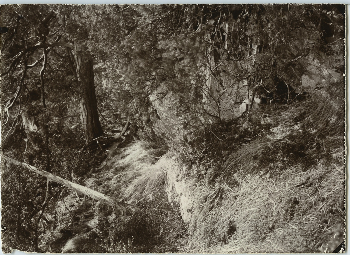 'Berguv, boet med omgivande terräng. Tallar och högt gräs i sluttning. :: :: Se fotonr. 27-29.'