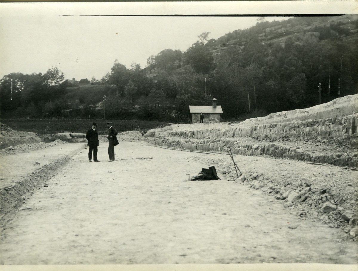 'Vy över fyndplatsen av Göteborgs Naturhistoriska museums subfossila kronhjortshorn. Fynddatum: 1913-06-00. Med på bilden finns 2 män på en väg samt 1 tredje man stående framför 1 mindre byggnad. I bakgrunden skog. :: :: Se fotonr. 269:1-3. Se även fotonr. 620, 4478 och 1044.'