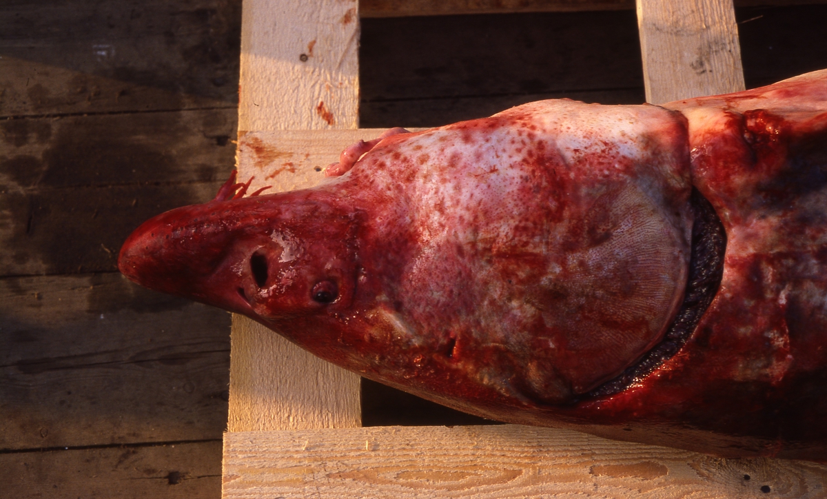 'Stör fångad i Nordsjön: :: :: Närbild på huvudet. Gällock. :: :: Ingår i serie med fotonr. 6029:1-12. Se även fotonr. 6028.'