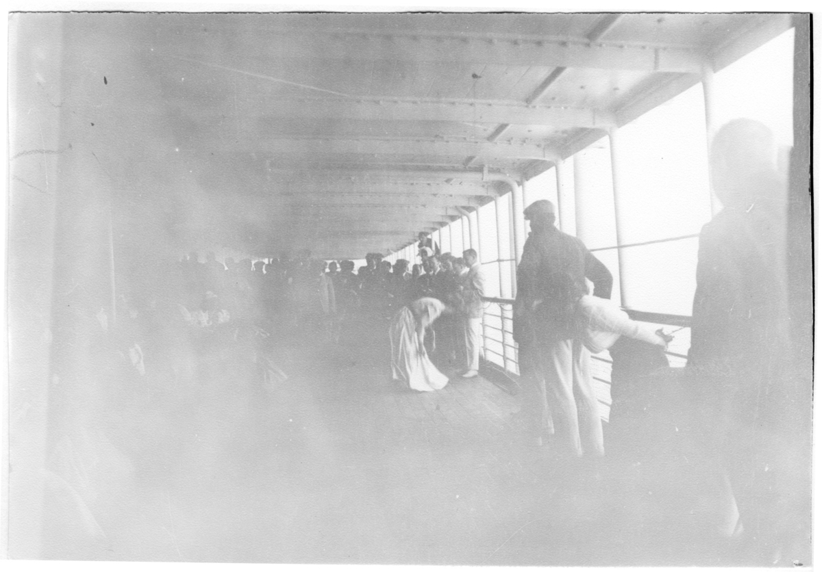 'Diverse fotografier från bl.a. dåvarande Nordrhodesia, nu Zambia, tagna av Konsul Magnus Leijer. :: :: En grupp kvinnor och män ståendes på däck ombord på en båt. :: Dålig kvalité på fotokopian, därav svårt att se motivet.'