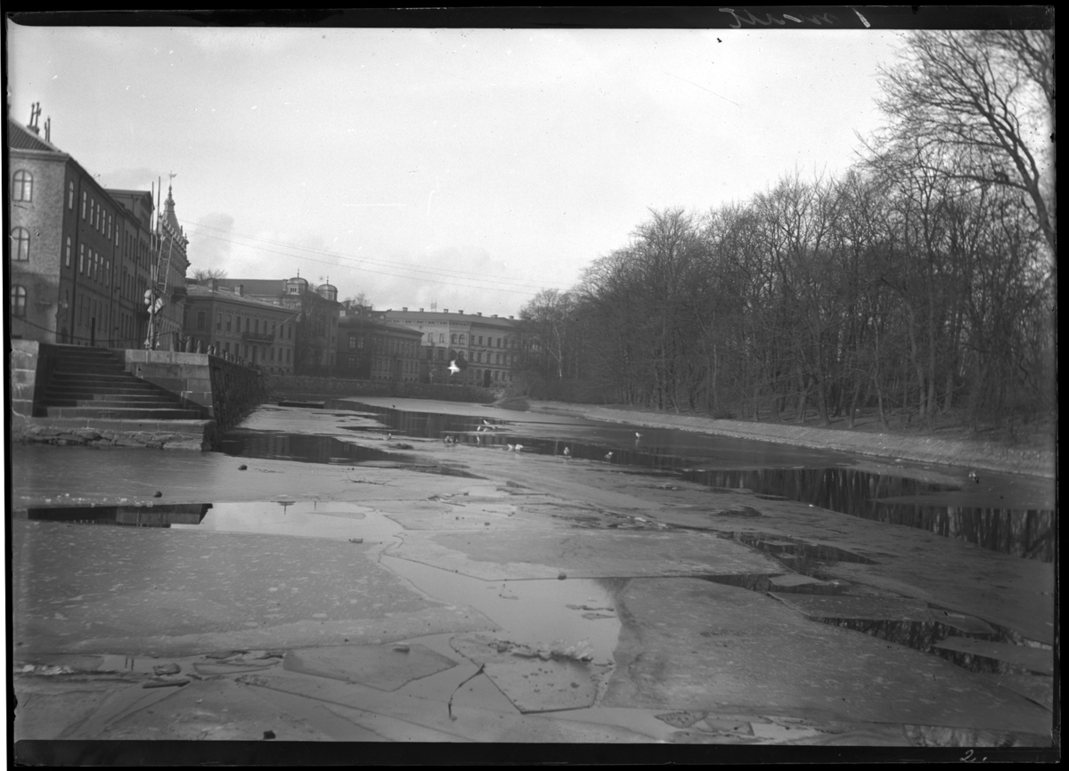 'Vy över delvis frusen vattenyta ev flod, å genom stad, stora hus på ena sidan. Uppbrutna isflak. :: :: Ingår i serie med fotonr. 5281:1-13. Se även fotonr. 5269-5292 med bilder från Stuxbergs resa till Kaukasien.'