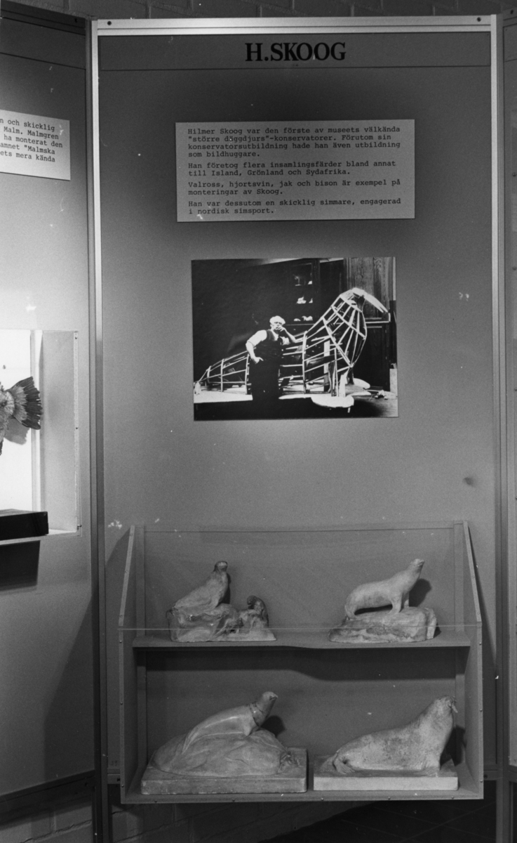 'Foto på Jubileumsutställningen, Göteborgs Naturhistoriska museum 150 år. :: :: Utställningsskärm tillägnad konservator Hilmer Skog, med prtträtt på densamme invid en av sina halvfärdiga monteringar samt djurfiguriner av honom huggna.'