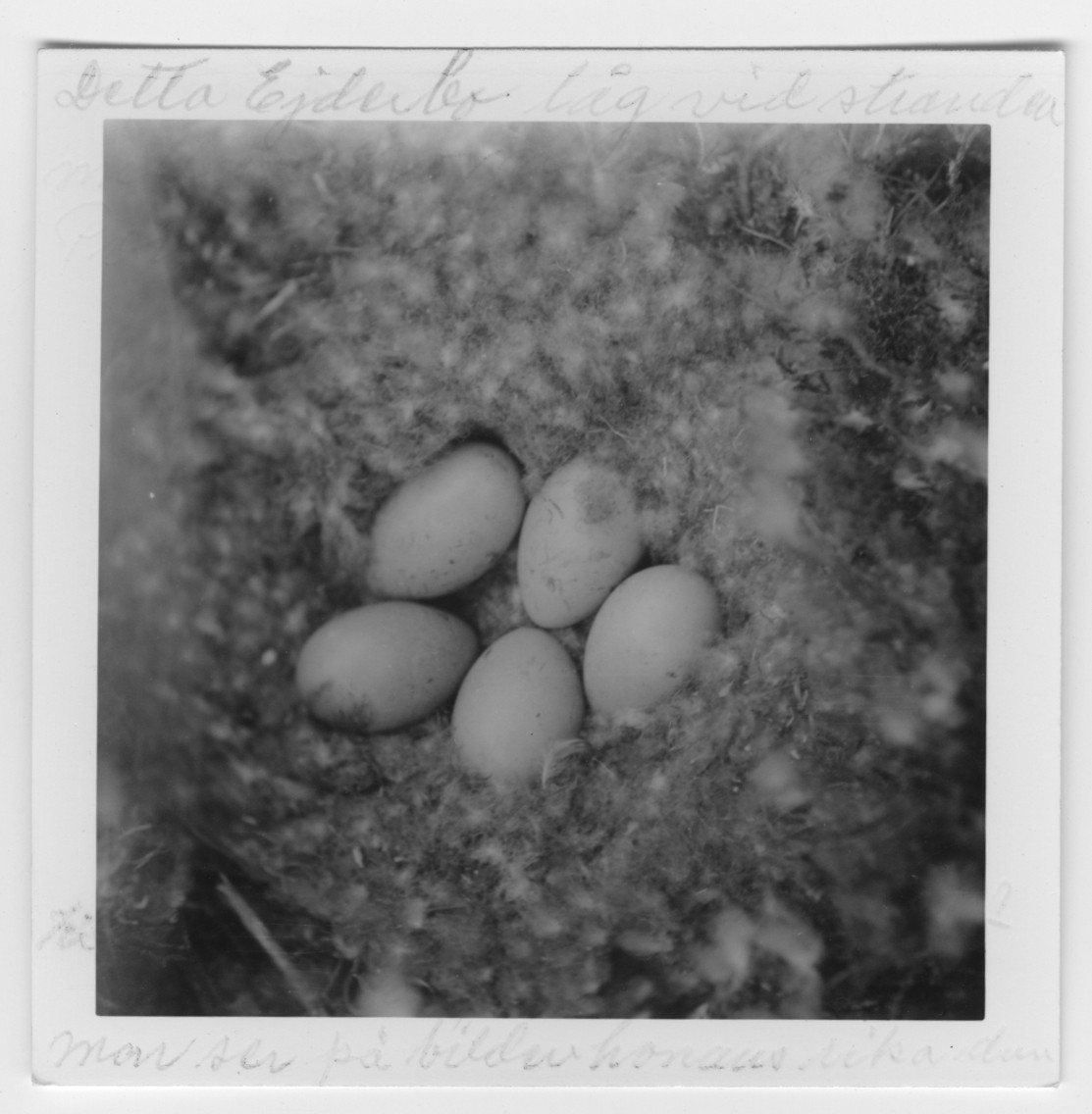 'Bo med dun och 5 st ejderägg. Dun i boet. :: :: Text på fotot: ''Detta ejderbo låg vid stranden mellan norra och södra Porsholmen. Kolonin bestod av över 100 par, man ser på bilden honans rika dun.'' :: :: Ingår i serie med fotonr. 4545:1-34.'