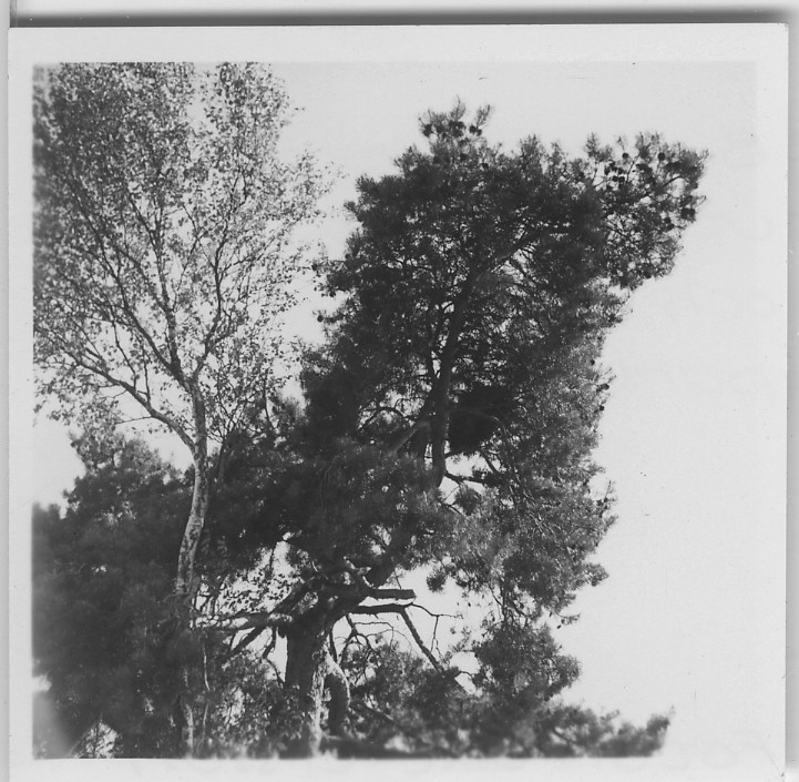 'Biologiska föreningens utfärd till Sveafallen och Villingsbergs kronopark. :: :: 1 tall, växande på en udde i vatten där ett lövträd växt upp alldeles intill. Fotograferat ur fyra vinklar, se foto nr: 4226: 6-9. Närbild på trädkronorna. :: :: Se fotonr. 4226:1-34, 4228:1-3 och 4229:1-3 från samma utfärd.'