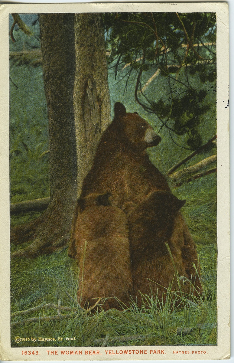 Svartbjörn, hona med 2 ungar. Ett vykort skickat från Yellowstone park till zoologiska avdelningen Göteborgs museum. Text på kortet ''Hjärtliga hälsningar! Utan tvivel hör denna nationalpark till det underbaraste jag hittills skådat - vilket dock kanske ej säger så mycket. Från Prof. Carl Skottsberg till Leonard Axel Jägerskiöld 26 augusti 1926.