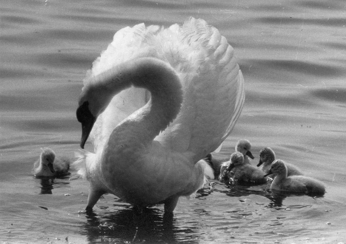 En i vatten stående knölsvan med simmande fågelungar samlade bakom sig. Knölsvanens vingar är utspärrade och halsen krökt. Fotograferad från nära avstånd.,
