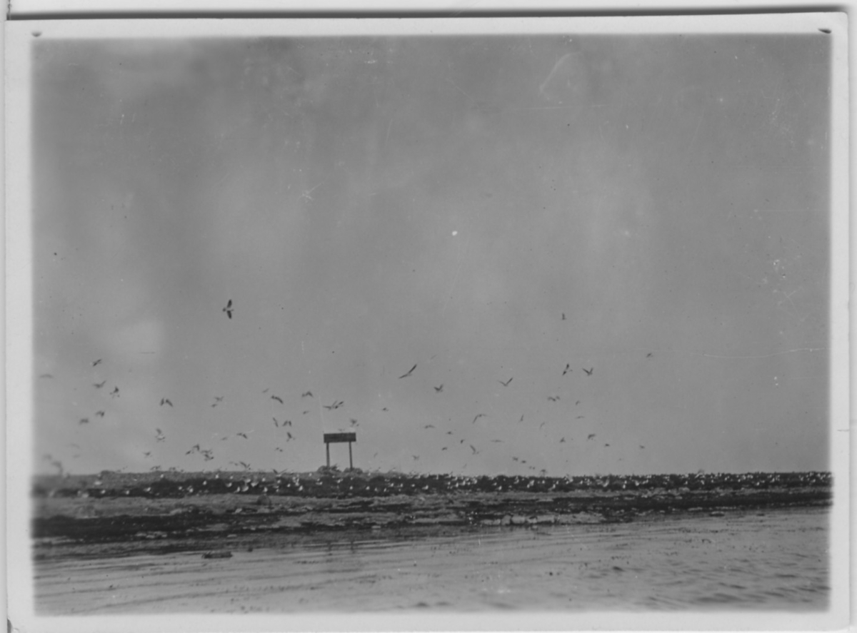 'Koloni, flygande fågelmoln över in över land, från havet. Vid strandkanten. :: :: Se även fotonr. 1467 samt fotonr. 1762, samma motiv men annat avstånd.'