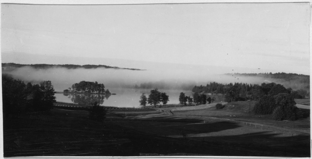 'Bildtext: ''Morgondimma över Ivarsbosjön.'' Vy över öppen mark med hägnad, på avstånd sjöns vattenytan med dimma och träddungar. :: :: Fotonr. 7048:27-37 indelad under rubriken ''Naturstudier''. Ingår i serie med fotonr. 7046:1-383, 7047:1-33 och 7048:1-67 med bilder från Länsjägmästare John Lindners bildarkiv.'