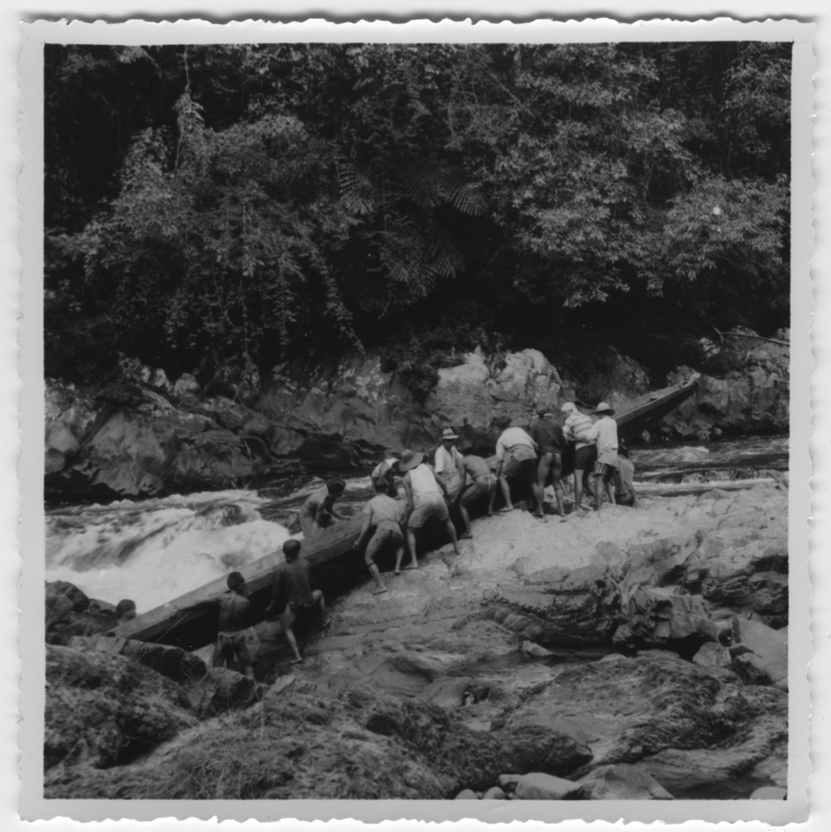 '14 st personer bär 1 kanot i floden. Text på baksidan: ''Vid ett vattenfall i Sembakongfloden. Kanoten måste dragas över land. R. Blomberg'' :: Ingår i serie med fotonr. 4038:1-4.'