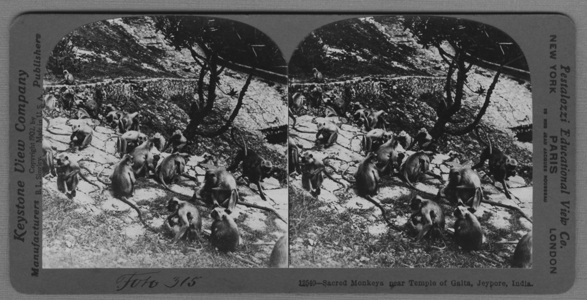 'Flock apor samlade på sluttning. :: :: Bildtext: ''12540- Sacred monkeys near Temple of Galta, Jeypore, India.'' :: :: Ingår i serie med fotonr. 315-422.'