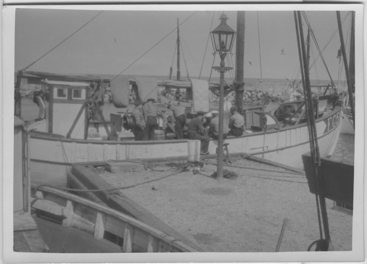 'Akkaexpedition, Bilder från Läsö och från båten (Skandia, FC 51). :: :: 5 män i arbete på däck ombord på en båten. I bakgrunden är land med byggnader synligt. Lyktstolpe. :: :: Se fotonr. 5089:12, samma motiv. Ingår i serie 5089:1-63. Se även fotonr 2401-2453.'