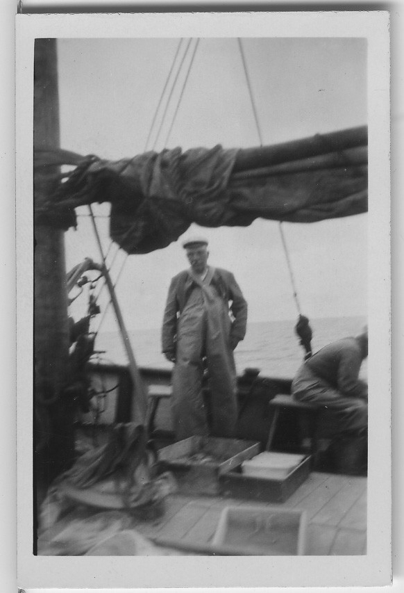 'Akkaexpedition, Bilder från Läsö och från båten (Skandia, FC51, FG51). :: :: 2 män ombord en båt, i arbete på däck. Lådor på båtdäcket. :: :: Ingår i serie 5089:1-63. Se även fotonr 2401-2453.'