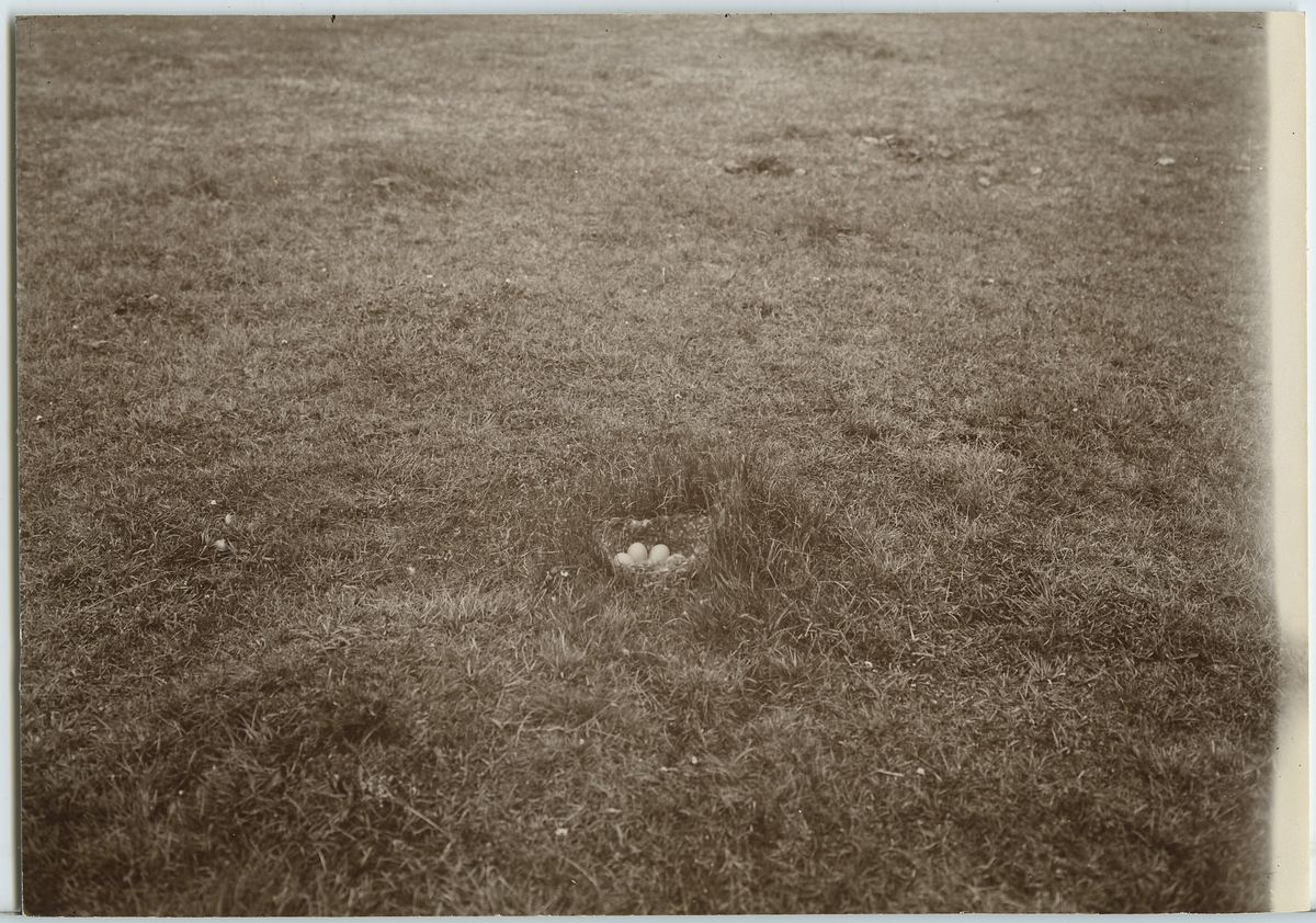 'Gräsand, bo med ägg på strandäng. Öppen gräsmark. På avstånd. :: :: Se även fotonr. 52.'