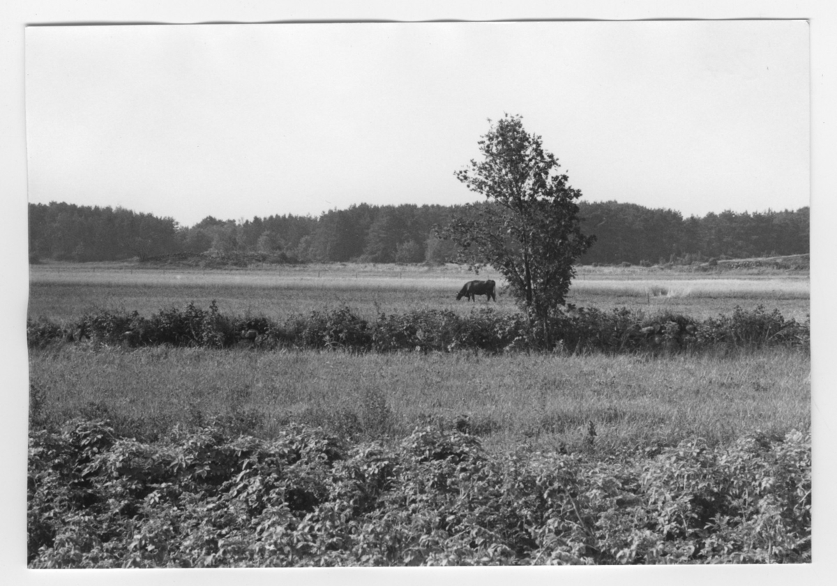'Bildtext: ''Sedimentyta. Riktning 212.'' :: Vy över öppna fält, åkrar, betesmark med betande boskap. I förgrunden potatisodling. Stenmurar. Stengärdesgård. :: :: Ingår i serie med fotonr. 6970:1-1125, dokumentation av Hisingens naturgeografi, visande landskapsformerna i stora drag och gjord inför exploateringen av området. Platserna för fotograferingen finns utsatta på karta i skala 1:4000 som finns på Göteborgs Naturhistoriska musem. Fotoriktningen mättes med kompass i gammalgrader.'