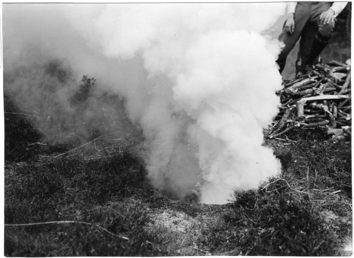 'Bildtext: ''Kolning i grop. Tändning har skett.'' Närbild på rök ur en kolningsgrop. :: :: Fotonr. 7046:369-382 indelade som ''Kolning.'' Ingår i serie med fotonr. 7046:1-383, 7047:1-33 och 7048:1-67 med bilder från Länsjägmästare John Lindners bildarkiv.'