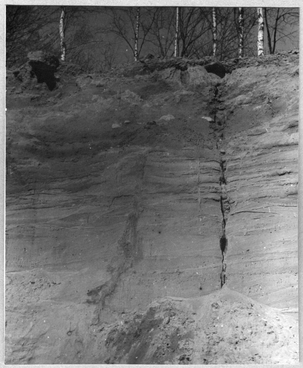 'Bildtext: iskilar (?) i D1-sand. Obs! ligger stratigrafiskt högre upp än vindslipade stenarna, som iakttagits på lägsta höjd 9,5 meter över havet. :: D1 och D2 korridoren. Nedre grustaget, norra väggen. Mjälaränden. :: Bilderna med fotonr. 7061:7-8 hör samman och har samma bildtext. :: :: Ingår i serie med fotonr. 7061:1-14. Serien består av material från Åke Hillefors (inkommet 2004).'