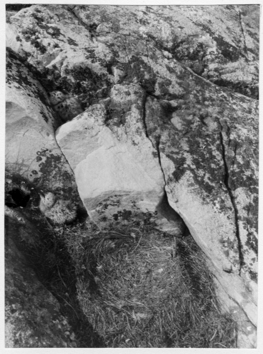 'Fågelunge vid bo i bergskreva. :: :: Fotonr. 7048:27-37 indelad under rubriken ''Naturstudier''. Ingår i serie med fotonr. 7046:1-383, 7047:1-33 och 7048:1-67 med bilder från Länsjägmästare John Lindners bildarkiv.'