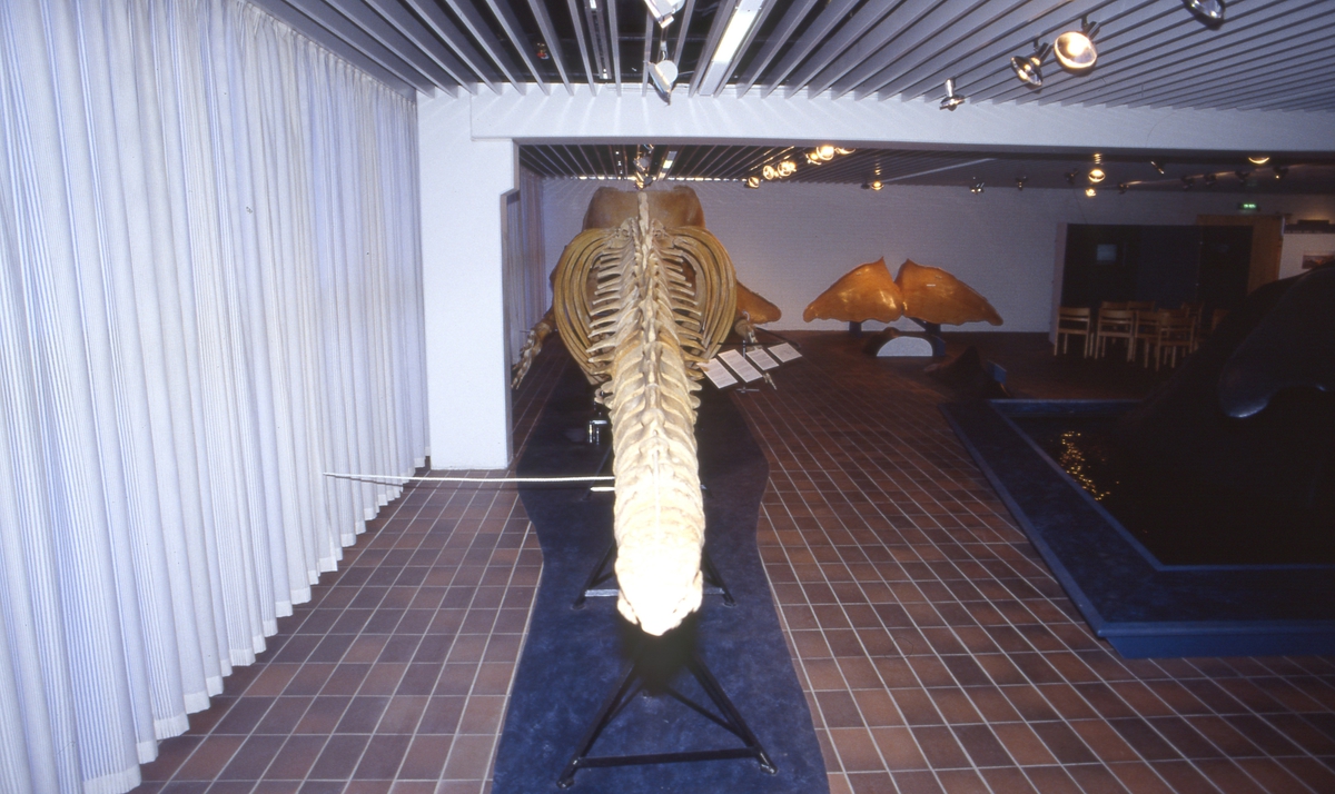 'Kaskelotskelettet sett från stjärtdelen, till höger kaskelotstjärten i bassäng med vatten. Gardiner för fönstren till vänster. :: :: Ingår i serie med fotonr. 6668:1-10 med foton från Kaskelotutställningen.'