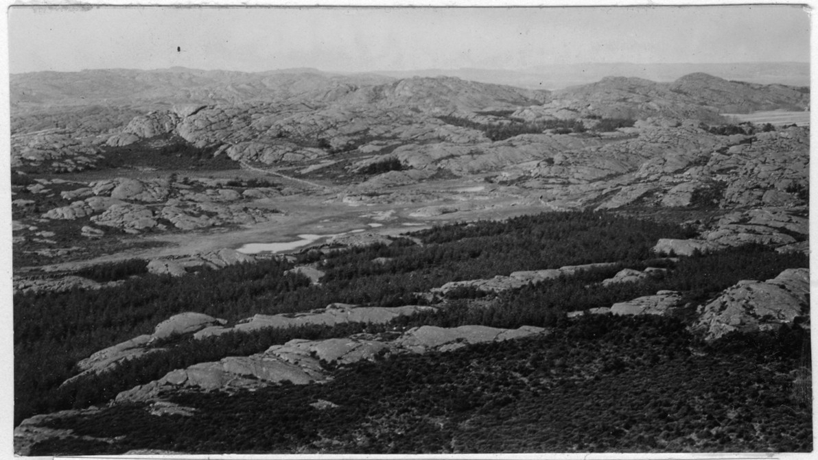 'Bildtext: ''Kulturskog på gammal ljunmark.'' Vy uppifrån ner mot bestånd av barrträd med omgivande kalt berg. :: :: Fotonr. 7046:275-292 indelade som ''Kulturskogsbestånd i Göteborgs län och Bohus län''. Ingår i serie med fotonr. 7046:1-383, 7047:1-33 och 7048:1-67 med bilder från Länsjägmästare John Lindners bildarkiv.'