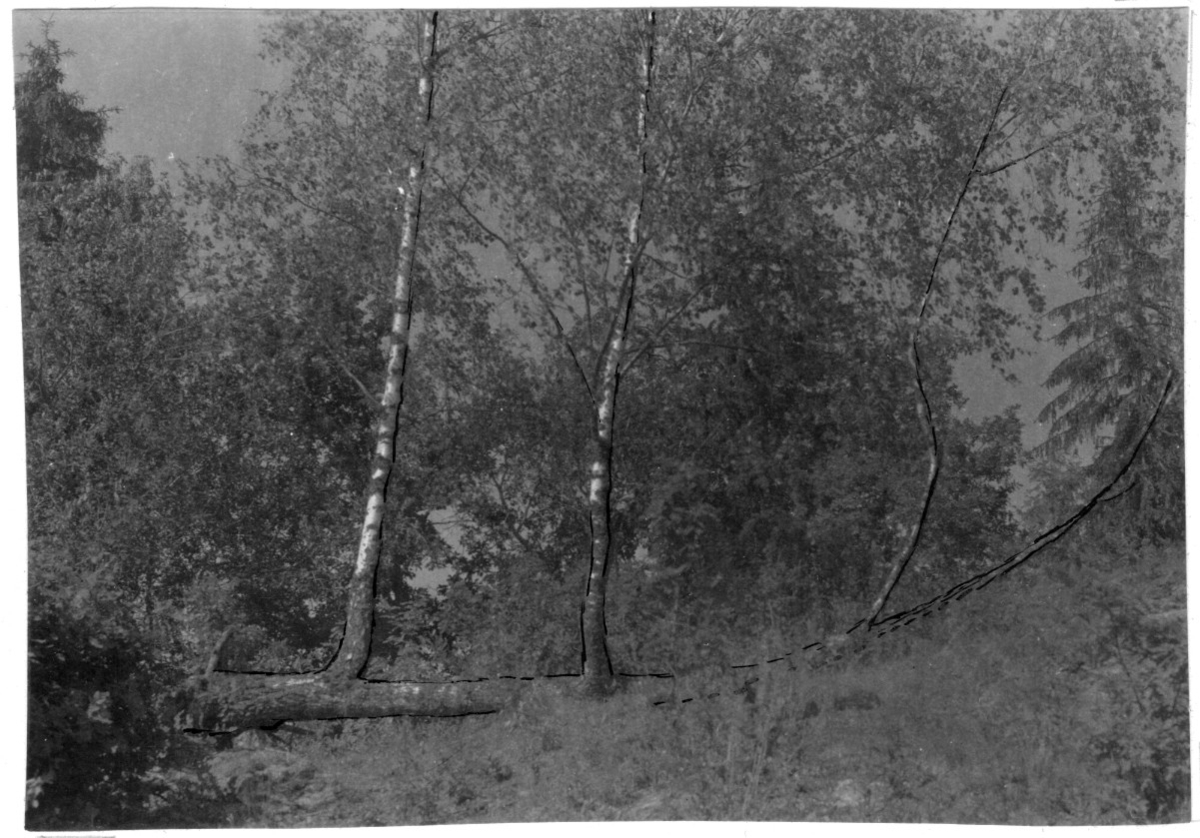 'Bildtext: ''Kullfallen björk, grenar uppväxta som träd.'' :: :: Fotonr. 7046:293-306 indelade som ''Skogsmarken. Trädens byggnad och livsföreteelser.''. Ingår i serie med fotonr. 7046:1-383, 7047:1-33 och 7048:1-67 med bilder från Länsjägmästare John Lindners bildarkiv.'