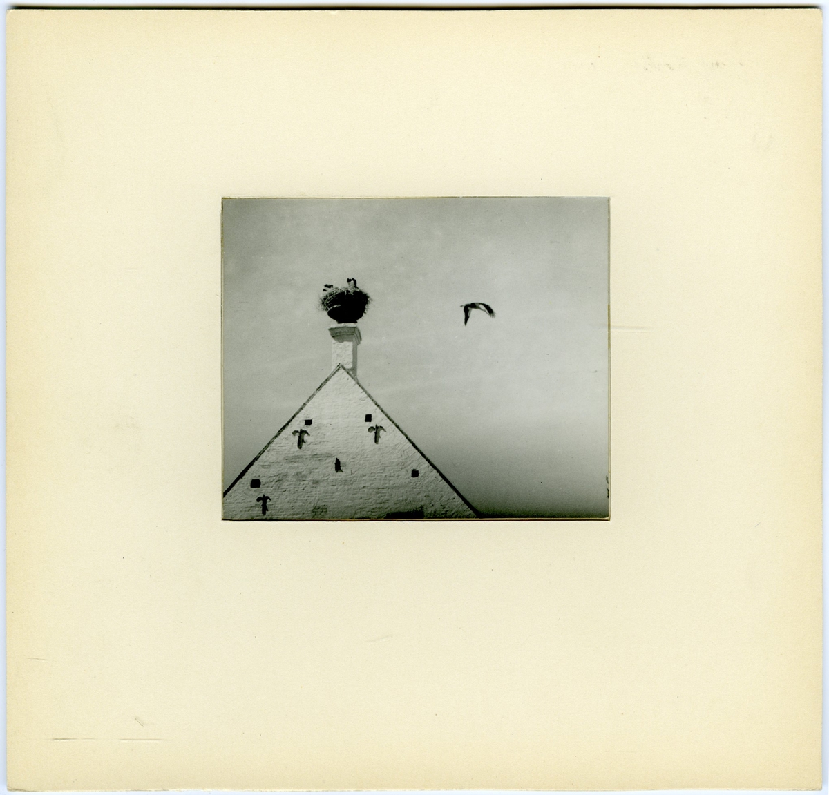 'Bildtext: ''Då ungarna matats lämnar den gamla storken boet för att söka upp ny föda.'' :: Vy med taknock med storkbo på skorstenen. Storkar i boet med ungar. 1 vuxen fågel flygande nära boet. :: :: :: Ingår i serie med fotonr. 7083:1-55.'