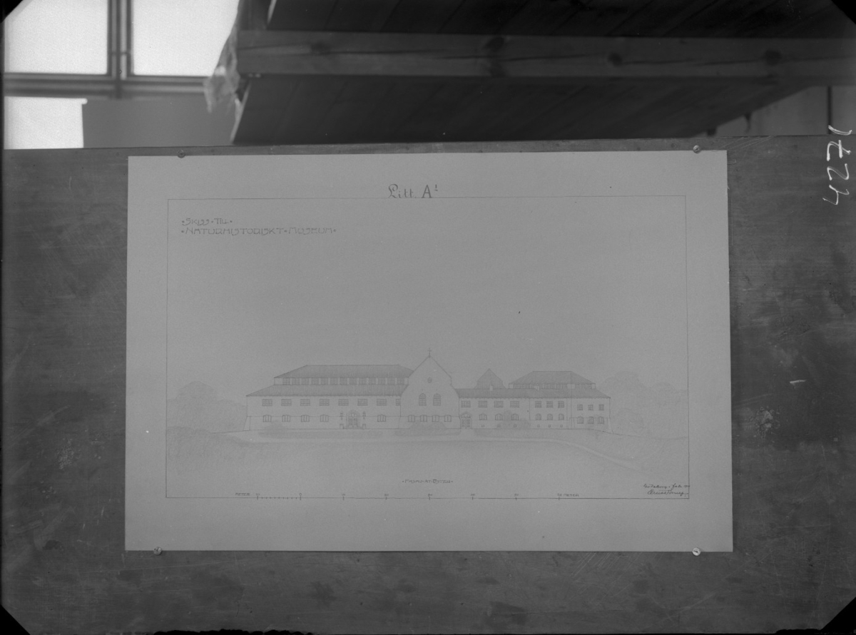 'Ritningar till nytt Naturhistoriskt Museum. Ritningarna avfotograferade mot vägg. (Signerade Ernst Torulf 1914). :: :: :: Litt A1. Byggnadens exteriör. :: :: Ingår i serie med fotonr. 4271:1-24.'