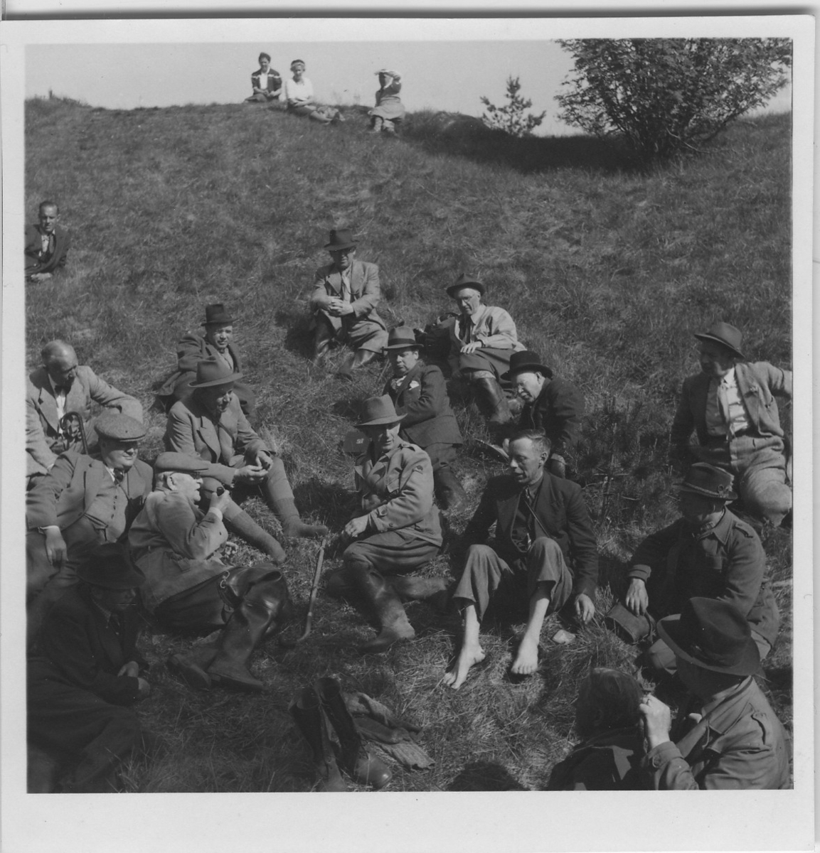 'Biologiska Föreningens utfärd till Oset och Kvismaren. :: :: Gruppen, ca 20 personer, män, liggandes och sittandes i en grässluttning. Leonard Axel Jägerskiöld halvliggande till vänster med stövlar och pipa i munnen, käpp liggande intill. 2 kvinnor och 1 man sittandes på toppen av sluttningen. Kläder. Klädsel. :: :: Ingår i serie med fotonr. 4386:1-18.'