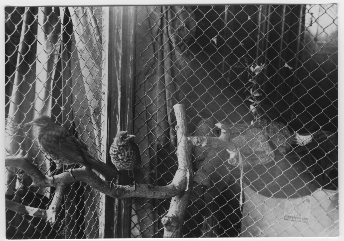 '2 st bastarder mellan björktrast och koltrast, i bur. :: :: Ingår i serie med fotonr. 4652:1-7. Se även fotonr. 4696.'