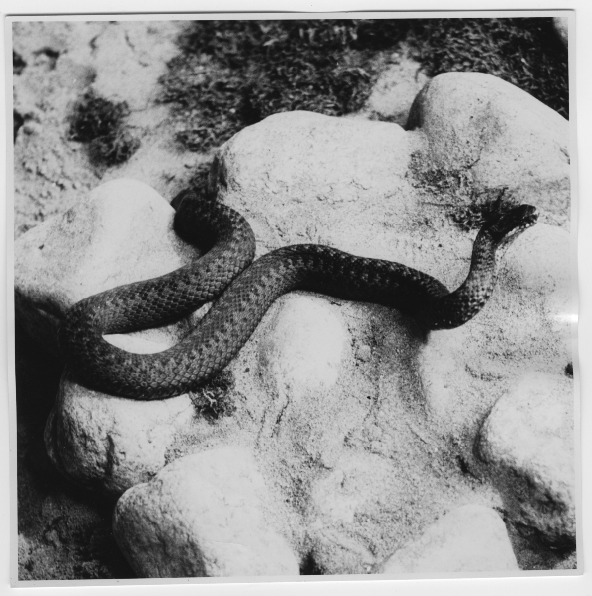 '1 st orm ligger på stenblock. :: :: Ingår i serie med fotonr. 4501:1-60 ur ingenjör Otto Cyréns ''Ormar i fantasi och verklighet''.'