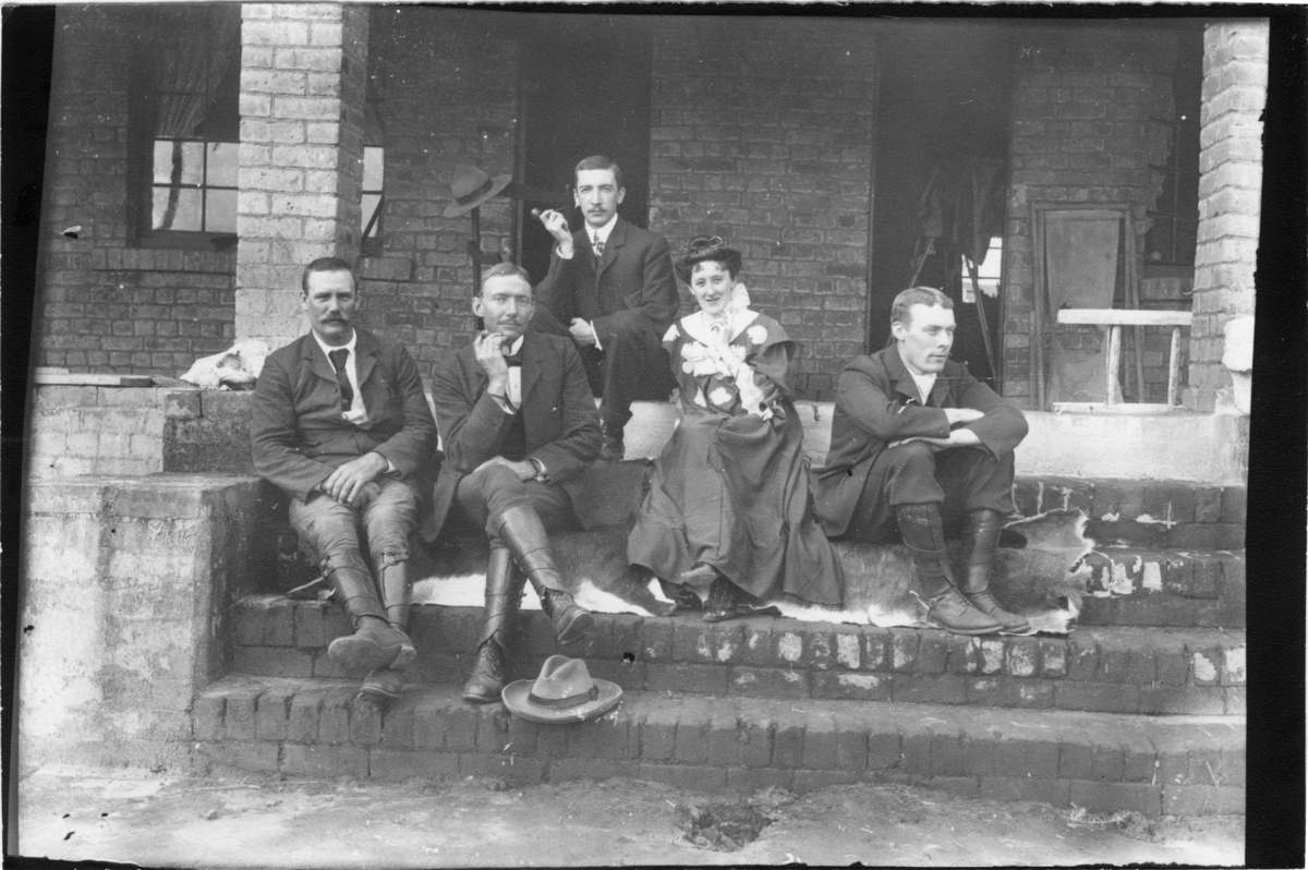 'Diverse fotografier från bl.a. dåvarande Nordrhodesia, nu Zambia, tagna av Konsul Magnus Leijer. :: :: Fyra män och en kvinna sittande på trappan till en tegelbyggnad.'