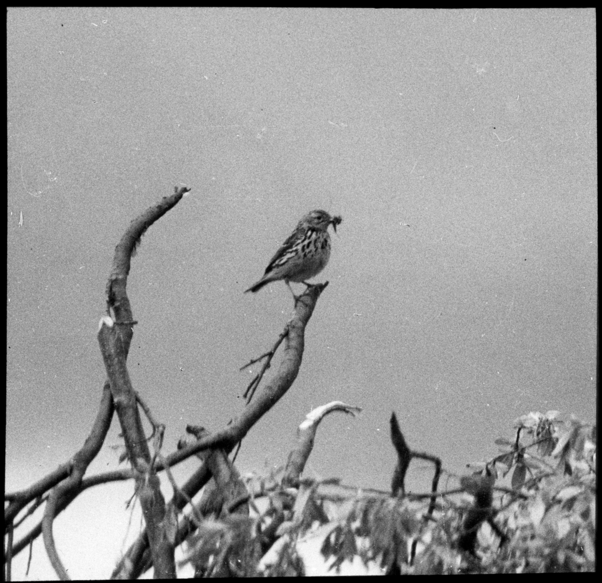 'Rödstrupig piplärka sittande längst ut på en avbruten gren med föda i näbben. :: :: Ingår i serie med fotonr. 5162:1-8, se även hela serien fotonr. 5155-5162.'