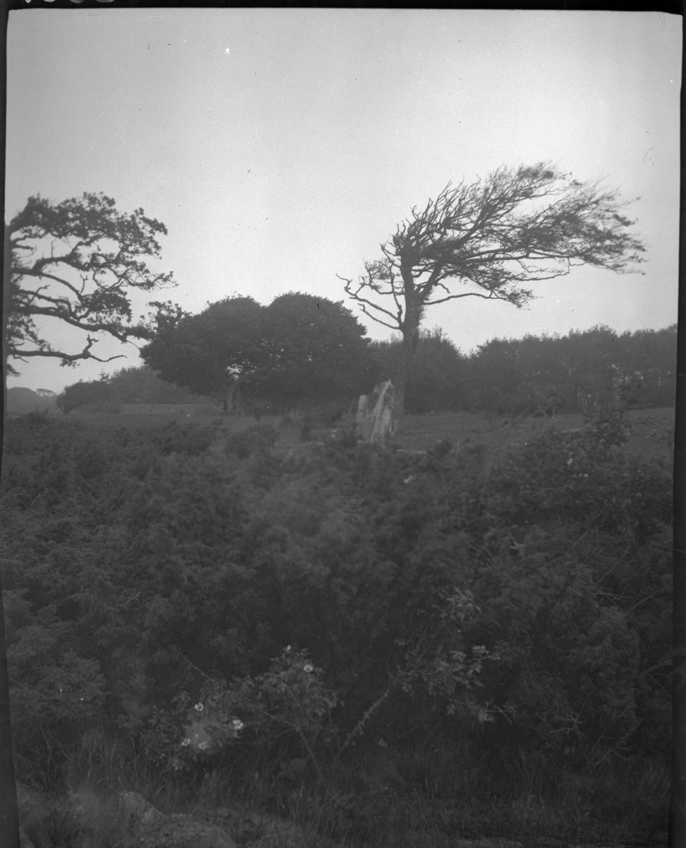 'Vy med vindpinade träd. I förgrunden lågväxande enbuskar. :: :: Ingår i serie med fotonr. 862-871.'