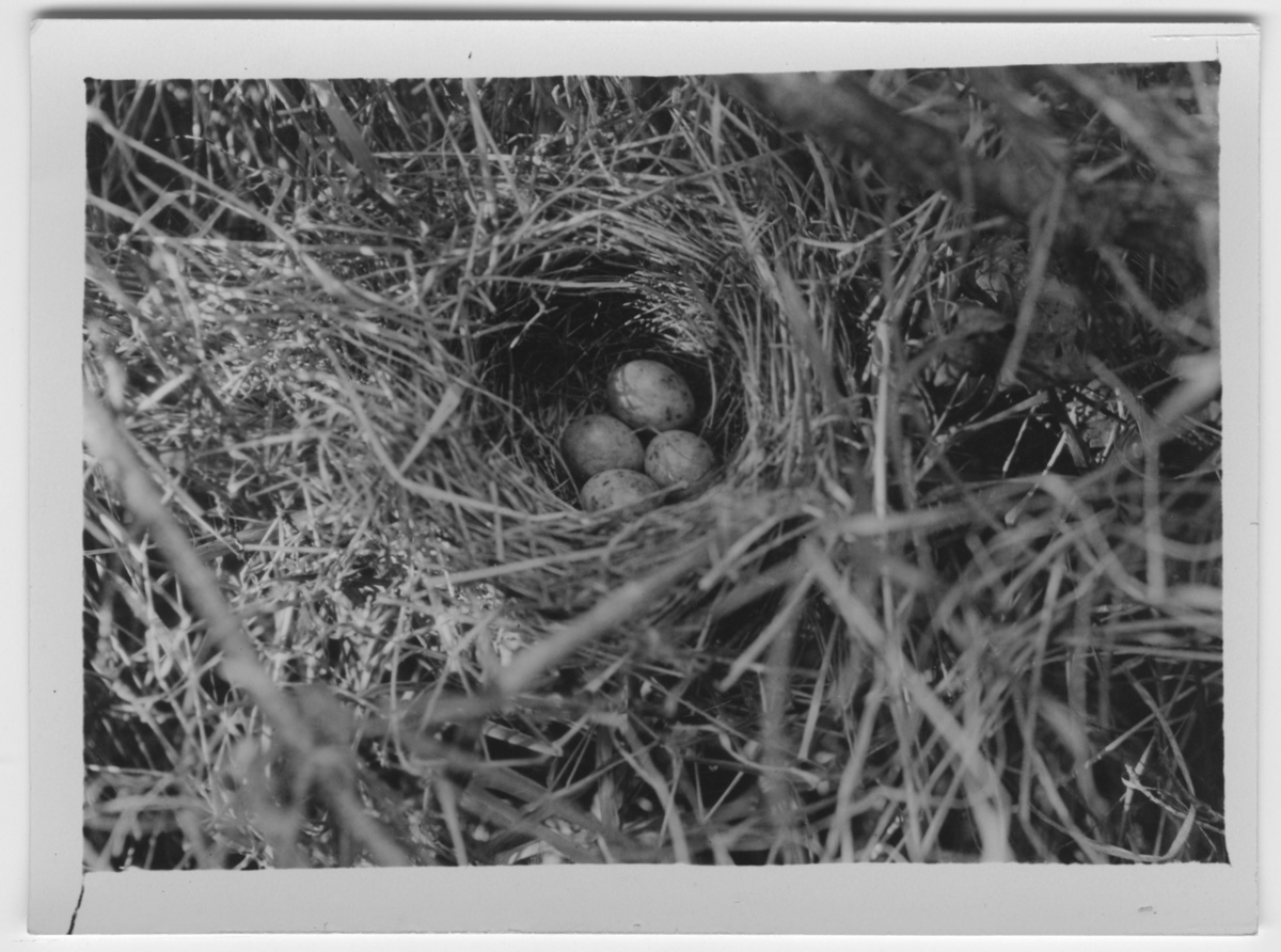 'Trädgårdssångarebo med 4 ägg. :: :: Ingår i serie med fotonr. 4102-4109.'