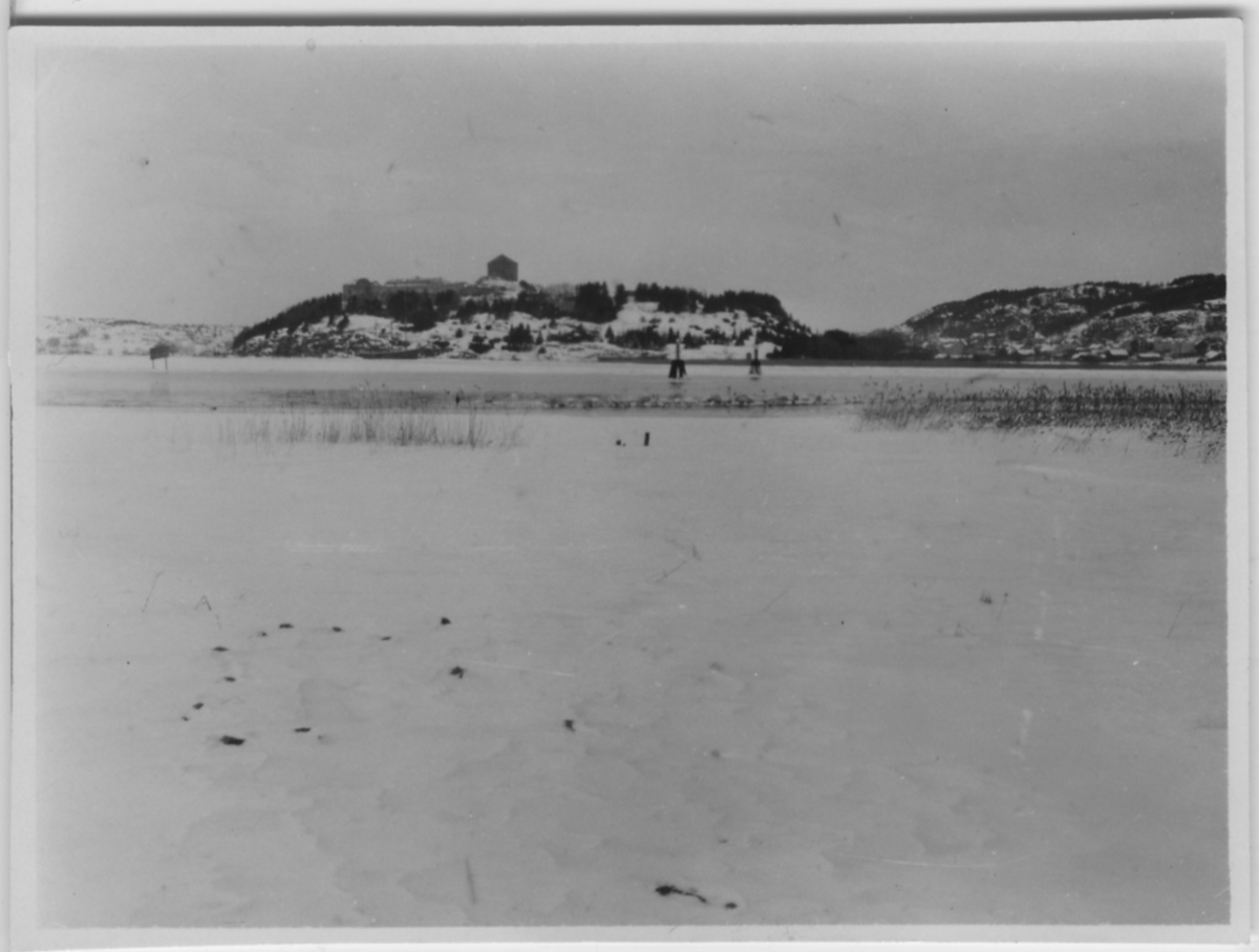 'Svanar vid Bohus: :: Vy med delvis frusen vattenyta, delvis isbelagd. Vy med Bohus fästning på avstånd. :: :: Ingår i serie med fotonr. 1490-1493.'