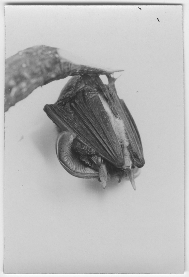 'Långörad fladdermus, hane, hängande, sedd snett framifrån. Närbild. :: :: Ingår i serie med fotonr. 1851-1861.'