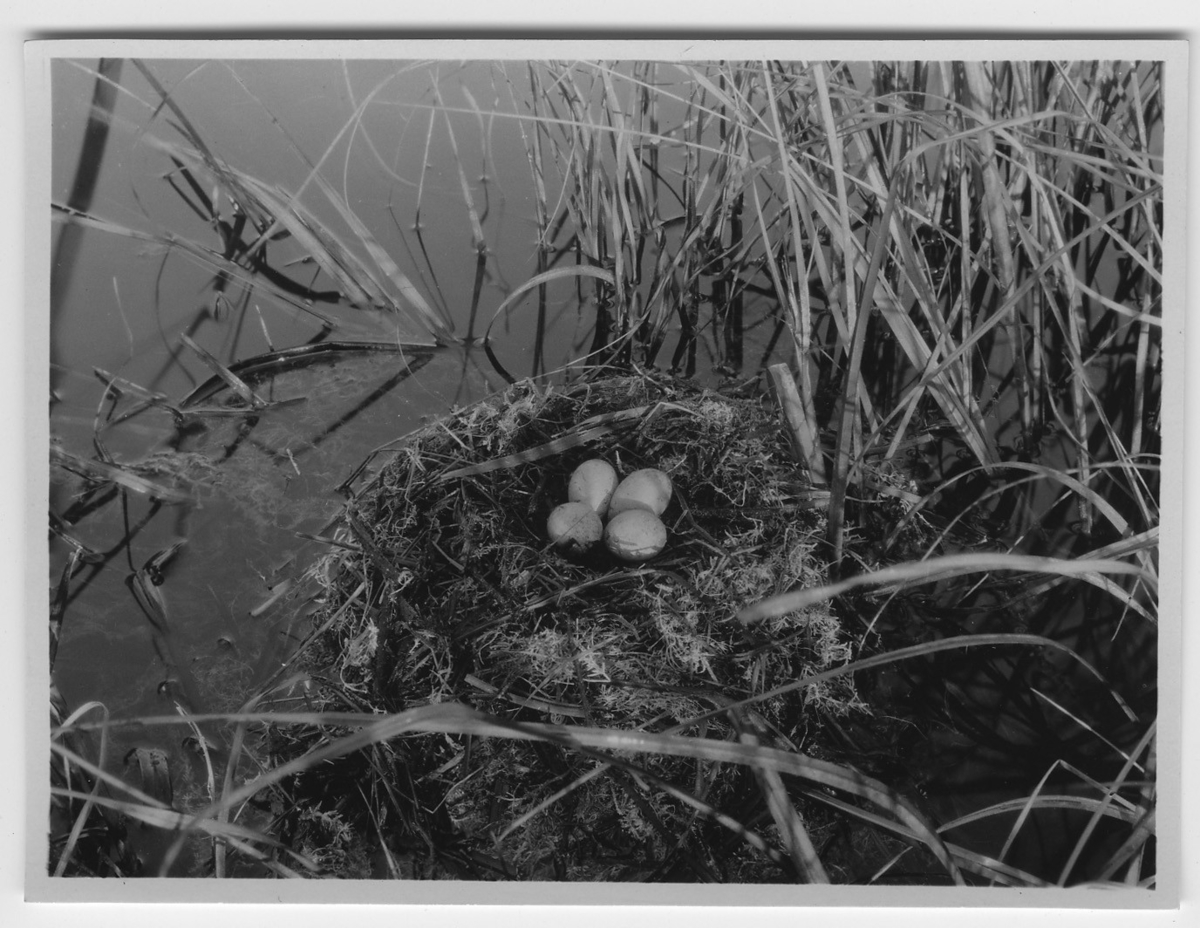 'Svarthakedopping, bo med 4 ägg, boet i vatten, mosse. Närbild. Våtmark. :: :: Se serie med fotonr. 1305-1356.'