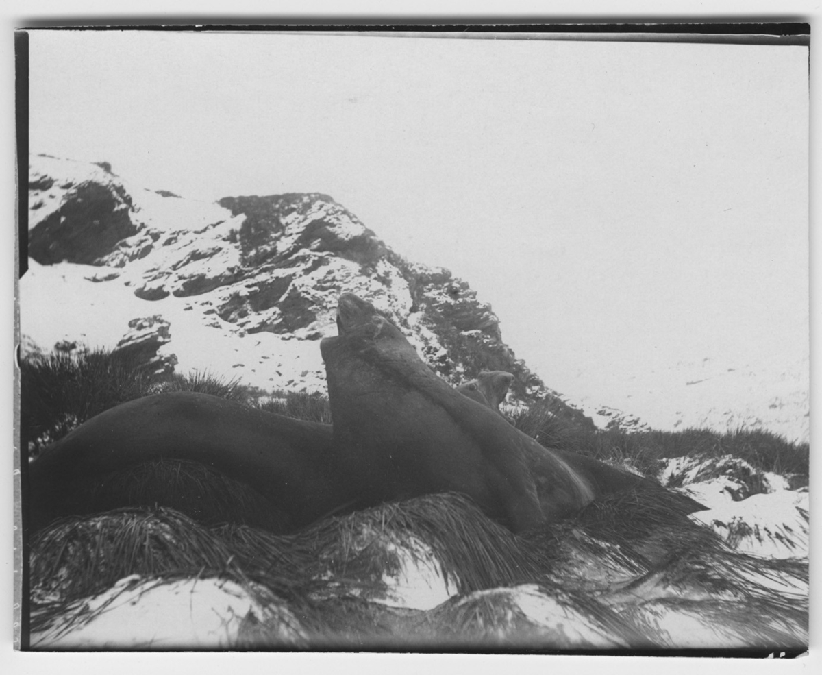 '2 st sjöelefanter på snöklädd mark. :: :: Ingår i serie med fotonr. 1170-1173.'
