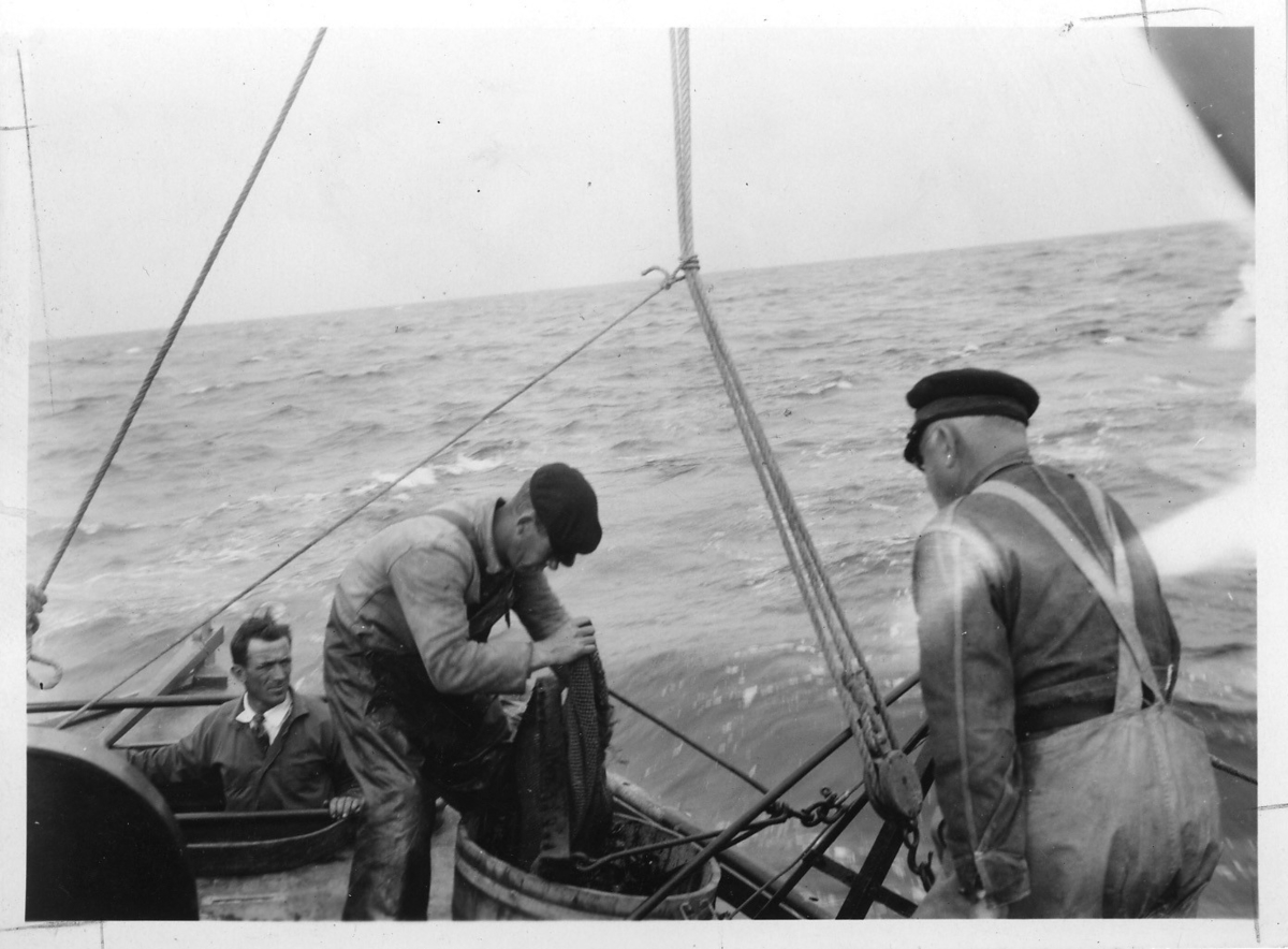 'Akka-expeditionen sommaren 1930: :: :: 3 st män på däck, en trekantsskrapa tömmes. :: :: Ingår i serie med fotonr. 2033-2087.'