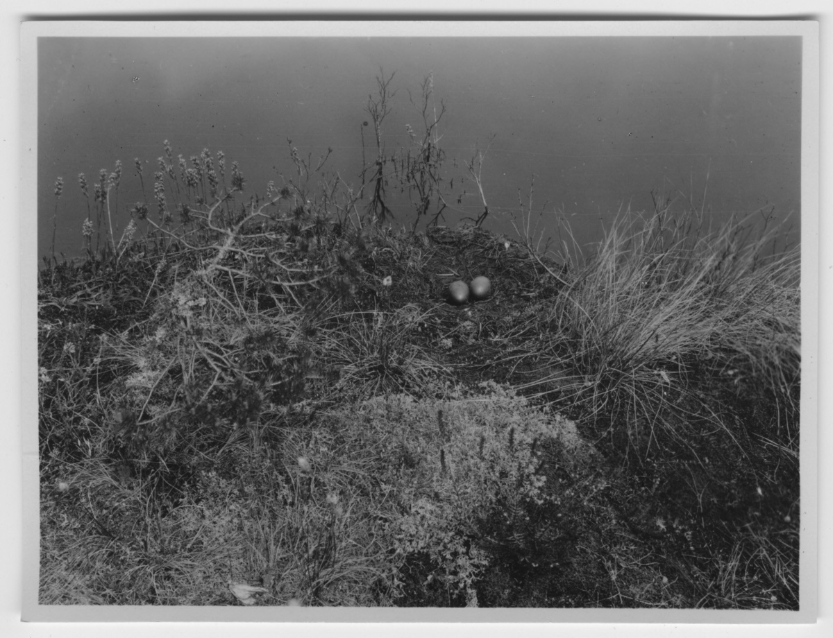 'Smålombo med 2 ägg invid en tjärn i Hindåstrakten, :: :: Se serie med fotonr. 1258-1304.'