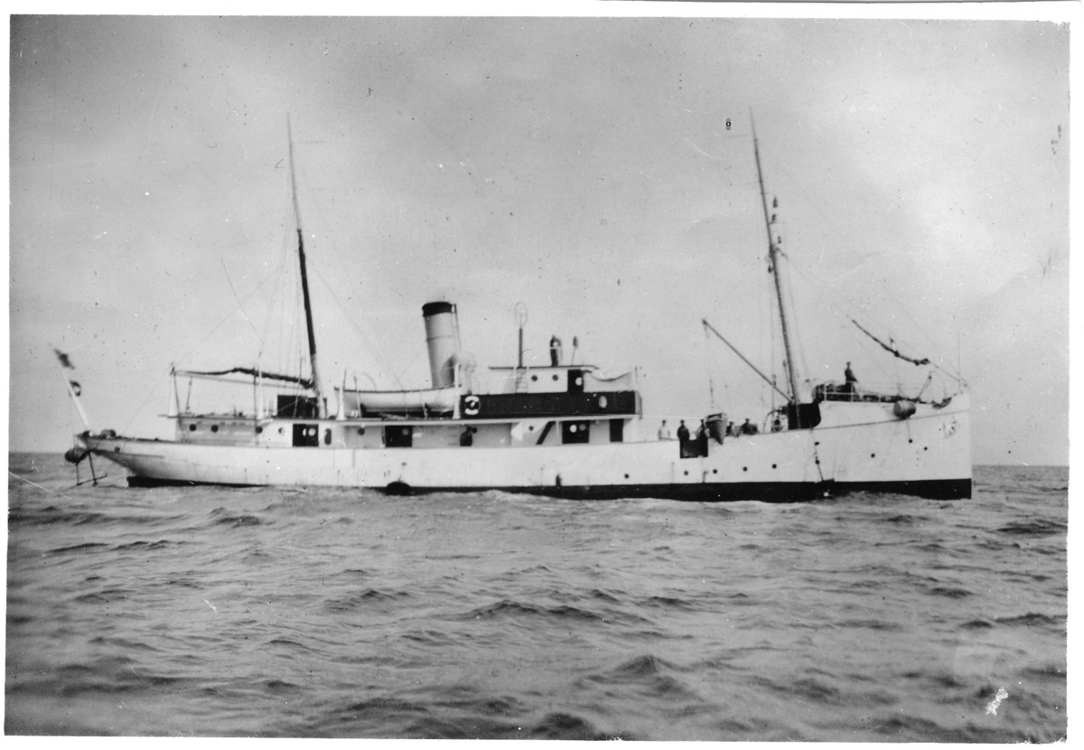 '''Skagerrak'' på strömmätningsexpedition i södra Östersjön, :: helbild på båten. Ca 10 människor på däck samt livbåt hängande ovan däck. :: :: Ingår i serie med fotonr. 2782-2792 med bilder av fångstredskap för havsdjur som använts på bevakningsfartyget Skagerak.'